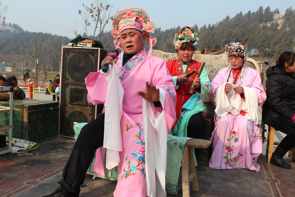 该剧团在一辆卡车车厢上搭起流动舞台,上面拉起“梁山县大路口乡花鼓戏演出”的横幅,人员有七人,三个穿鲜艳戏剧服装的演唱者,四个锣、鼓、梆子等敲打者,再有音响、上车箱的铁梯子,仅此而已,但是演唱者有板有眼、韵味十足的花鼓戏特有的腔调、唱词,非常吸引笔者的视觉和神经,赞叹、惊讶至极。演唱者先是一位粉色戏装书生打扮的男人,坐在后面的板凳上,后来起来凳子演唱,在前面小场地上“走场”。板凳上搭一块布,就算是舞台的“正规”道具了。又有同样粉色戏装小姐扮相的女人演唱,还有个胖胖的穿蓝衣红马甲的丫鬟。丫鬟又是空闲时还会接过来梆子再做伴奏员来敲打。演员们高高矮矮、胖胖大大,顺其自然,轻松自由,更大有大家风范,伴奏的乐队更是农民穿戴,一排溜坐在车厢边沿的各个小板凳上,还竟然朴实得给笔者让座,可爱、可亲之极。整个剧团简洁、爽朗,又有韵味,让人爱不释手、赏心悦目。